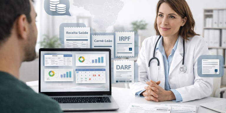 Receita saúde, carnê-leão, IRPF, emissão de DARF, organização fiscal mensal, regularizações.